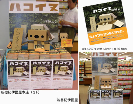 はなればなれになった少年を探すハコイヌの、旅の途中を描いた写真絵本が2004年8月31日、ジャイブ株式会社から都内大型書店を中心に発売されました。特に新宿、渋谷の紀伊國屋書店では100冊近い絵本を平積みで展開する特設コーナーが出現。そこでは絵本の表紙と同じポーズの実物大のハコイヌがお客様を迎えます。箱に入った本物のハコイヌにじっと見つめられると、思わず絵本を余分に買ってしまうかも!?